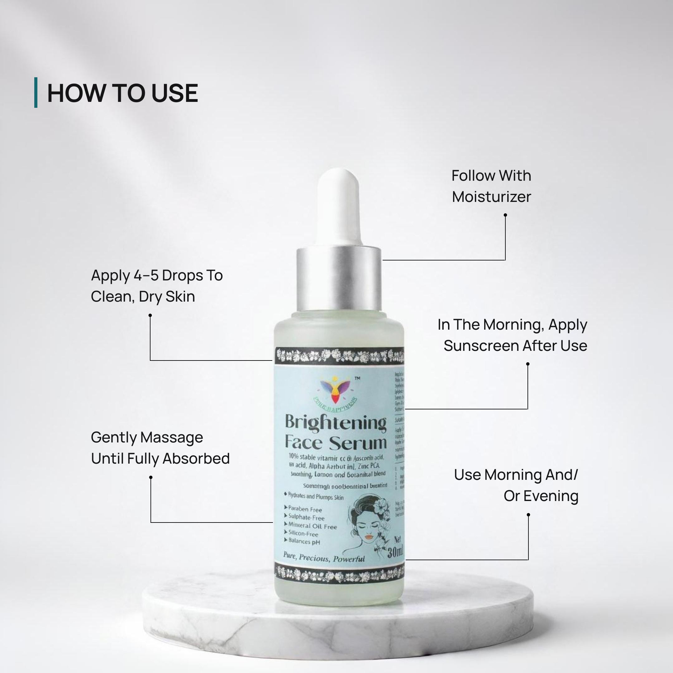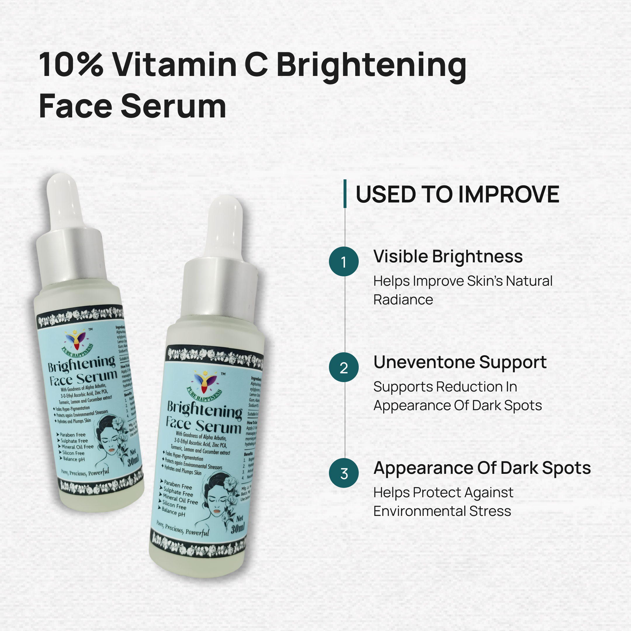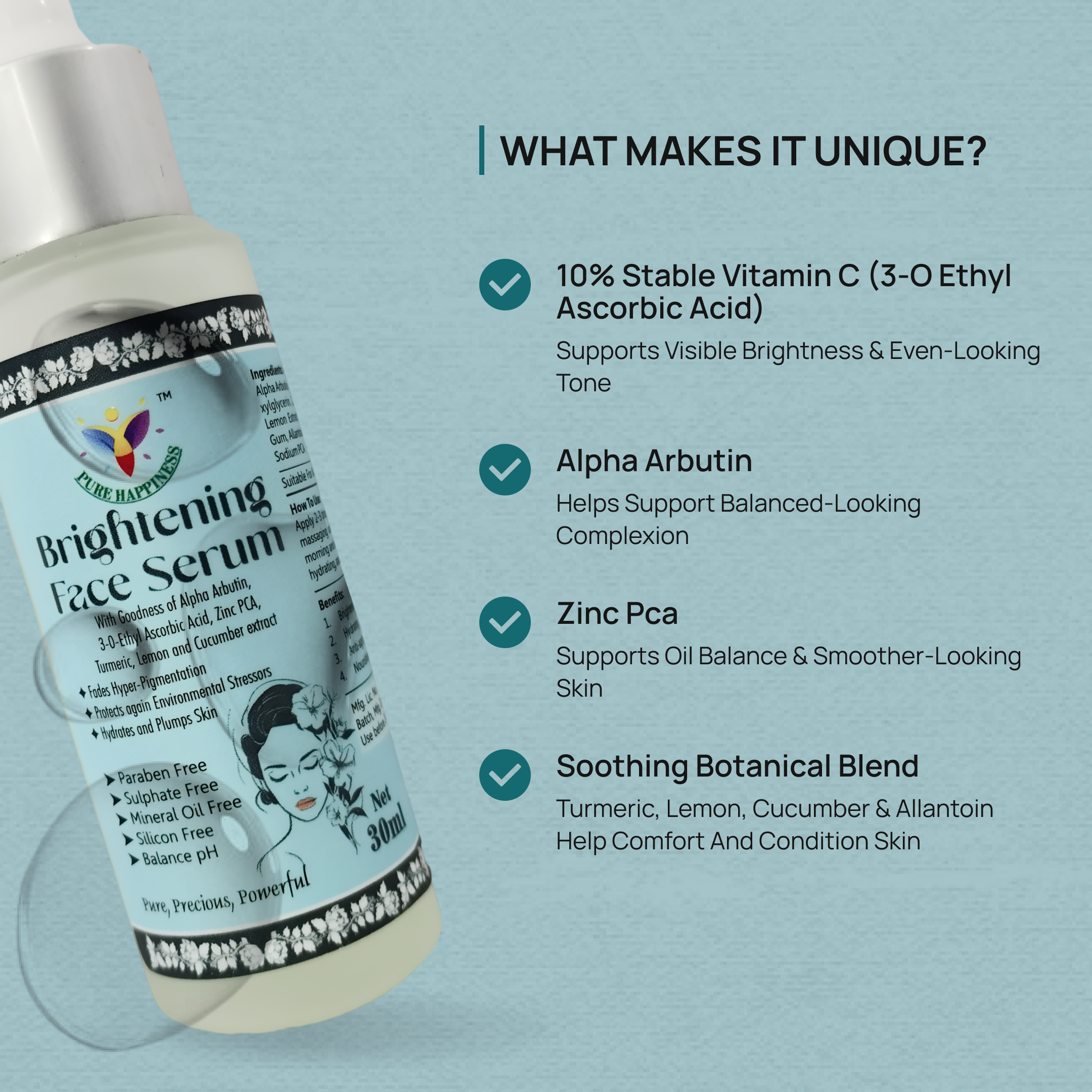 Pure Happiness brightening Serum is formulated with a stable Vitamin C derivative and skin-supporting ingredients that help visibly brighten, support pigmentation reduction, and protect against environmental damage without irritation or heaviness.