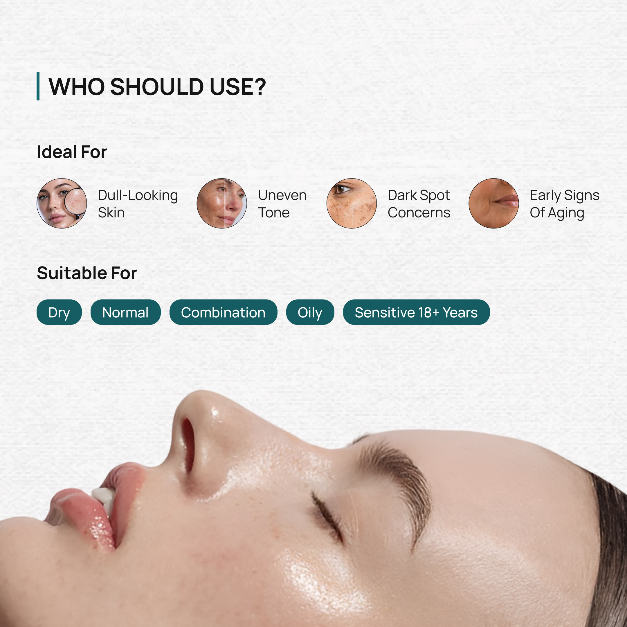 Dullness | Uneven tone | Dark spots | Early signs of aging | Environmental stress exposure